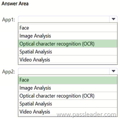 Which Azure AI Vision service does each app use? (To answer, select the appropriate options in the answer area.)