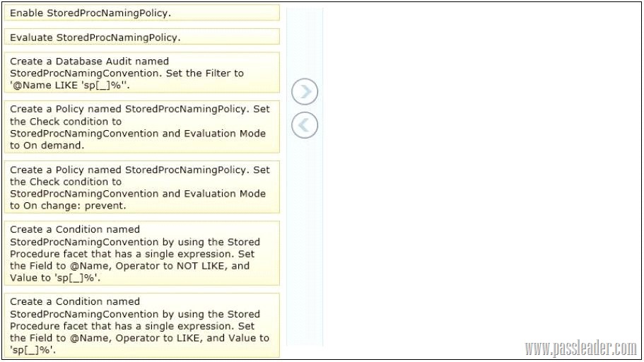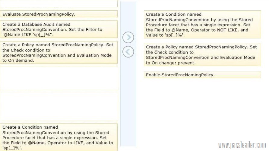 You administer a Microsoft SQL Server 2012 server that has multiple databases. You need to ensure that users are unable to create stored procedures that begin with sp_. Which three actions should you perform in sequence? (To answer, move the appropriate actions from the list of actions to the answer area and arrange them in the correct order.)