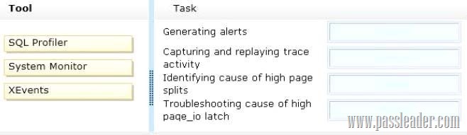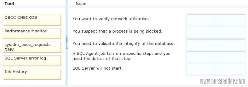 You administer a Microsoft SQL Server 2012 server. A variety of issues occur from time to time in the production environment. You need to identify the appropriate tool for each issue. Which tool or tools should you use? (To answer, drag the appropriate tool or tools to the correct issue or issues in the answer area. Each tool may be used once, more than once, or not at all. You may need to drag the split bar between panes or scroll to view content.)