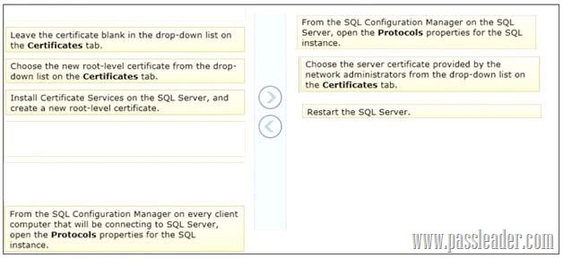 You need to configure SQL Server to encrypt all client traffic across the network. You also need to ensure that client computers are able to connect to the server by using a trusted certificate. Which three actions should you perform in sequence? (To answer, move the appropriate actions from the list of actions to the answer area and arrange them in the correct order.)