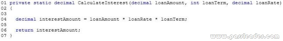 You are debugging an application that calculates loan interest. The application includes the following code. (Line numbers are included for reference only.) You have the following requirements: