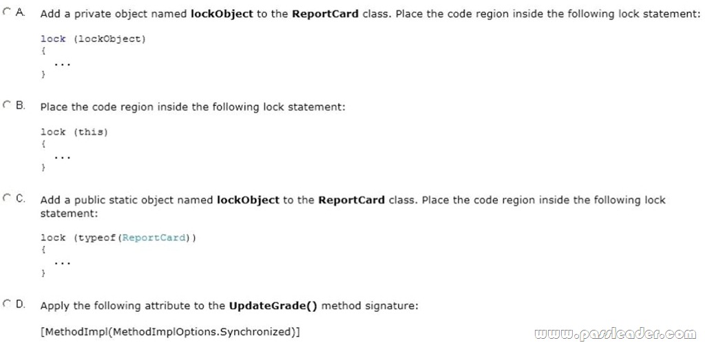 You are adding a public method named UpdateGrade to a public class named ReportCard. The code region that updates the grade field must meet the following requirements: