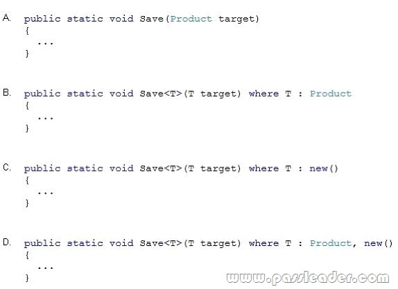 You are creating an application that manages information about your company’s products. The application includes a class named Product and a method named Save. The Save() method must be strongly typed. It must allow only types inherited from the Product class that use a constructor that accepts no parameters. You need to implement the Save() method. Which code segment should you use?