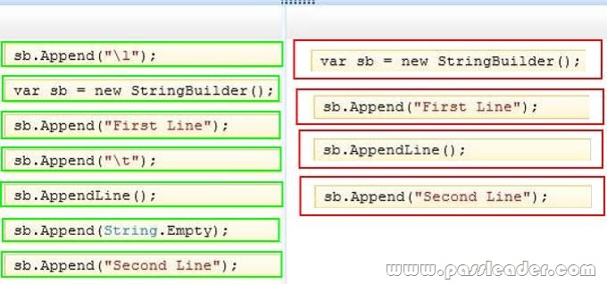 You are developing an application by using C#. The application will output the text string “First Line” followed by the text string “Second Line”. You need to ensure that an empty line separates the text strings. Which four code segments should you use in sequence? (To answer, move the appropriate code segments to the answer area and arrange them in the correct order.)