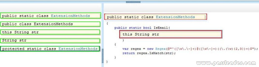 You are developing a class named ExtensionMethods. You need to ensure that the ExtensionMethods class implements the IsEmail() method on string objects. How should you complete the relevant code? (To answer, drag the appropriate code segments to the correct locations in the answer area. Each code segment may be used once, more than once, or not at all. You may need to drag the split bar between panes or scroll to view content.)