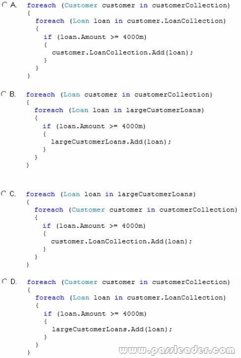 All loans with an Amount value greater than or equal to 4000 must be tracked. You need to populate the largeCustomerLoans collection with Loan objects. Which code segment should you use?