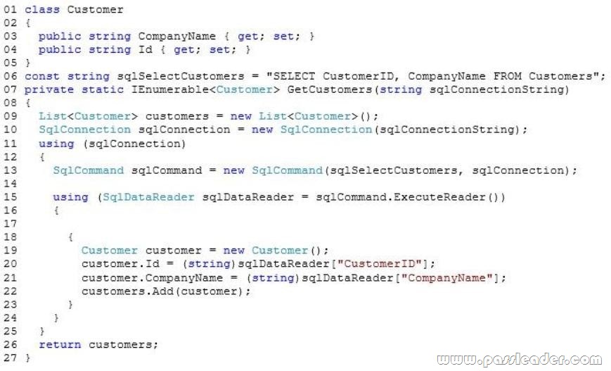 You are developing an application that includes the following code segment. (Line numbers are included for reference only.) The GetCustomers() method must meet the following requirements: