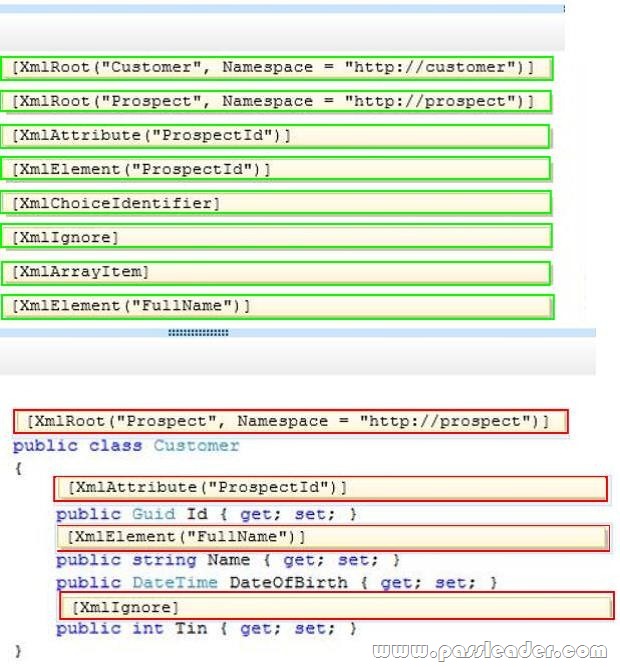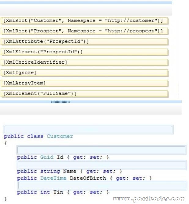 You need to ensure that the Customer class will serialize to XML. How should you complete the relevant code? (To answer, drag the appropriate code segments to the correct locations in the answer area. Each code segment may be used once, more than once, or not at all. You may need to drag the split bar between panes or scroll to view content.)