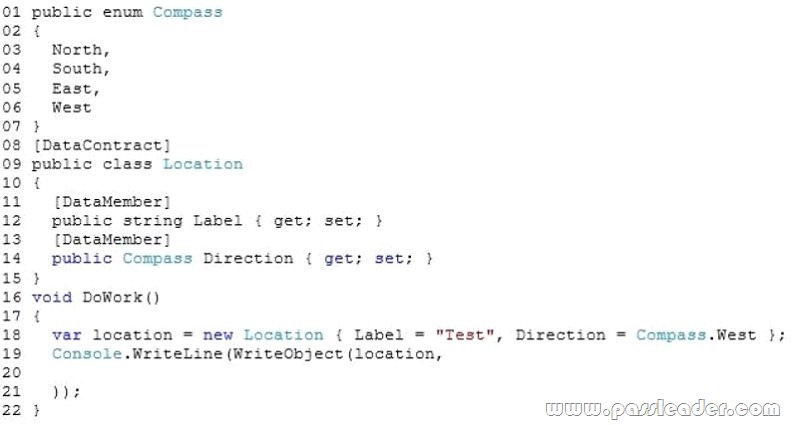 You are developing an application. The application converts a Location object to a string by using a method named WriteObject. The WriteObject() method accepts two parameters, a Location object and an XmlObjectSerializer object. The application includes the following code. (Line numbers are included for reference only.) You need to serialize the Location object as XML. Which code segment should you insert at line 20?
