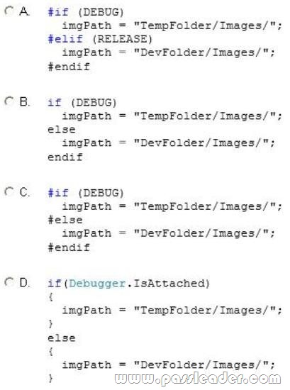 You are developing an application that will process orders. The debug and release versions of the application will display different logo images. You need to ensure that the correct image path is set based on the build configuration. Which code segment should you use?
